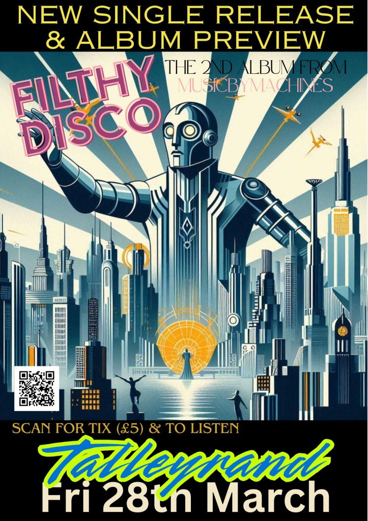 The next MusicByMachines gig is free. It aligns with the release of my new single, Rest of Me. So, come along to The Talleyrand to hear the new single and a preview of the upcoming album, Filthy Disco.